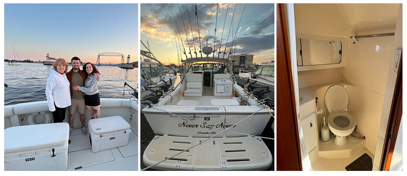 The galley of the "Never Say Never" is well-equipped to meet all your culinary needs while at sea. It includes a two-burner electric cooktop, a single stainless steel sink with hot and cold pressure water, and a 12VDC/110VAC refrigerator to keep your food and beverages fresh. The galley also offers functional cupboard and drawer storage, ensuring that all your cooking essentials are neatly organized and easily accessible. Powered by twin Crusader 454 350hp inboard engines, this boat delivers a total of 700 HP, allowing it to cruise comfortably at 22 knots and reach a maximum speed of 32 knots. With a fuel capacity of 295 gallons, a freshwater tank holding 46 gallons, and a holding tank capacity of 20 gallons, the "Never Say Never" is well-prepared for extended trips on the water.